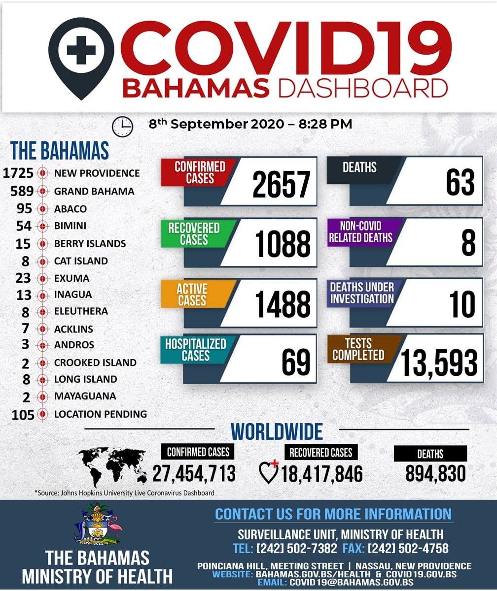 Of those cases, there were 1,725 in New Providence, 589 in Grand Bahama, 95 in Abaco, 54 in Bimini, 23 in Exuma, 15 in the Berry Islands, 13 in Inagua, eight in Cat Island, eight in Eleuthera, eight in Long Island, seven in Acklins, three in Andros, two in Crooked Island, and two in Mayaguana.