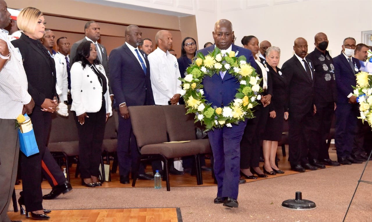 Prime Minister Philip Davis lays a wreath at a memorial service on Abaco.